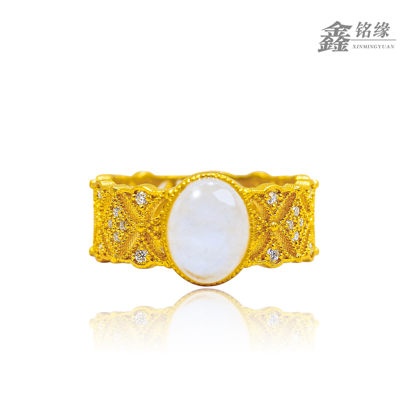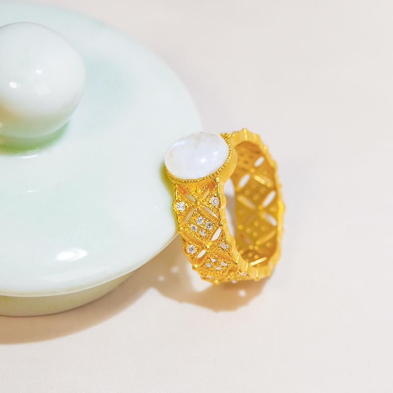 足金月光石点钻戒指