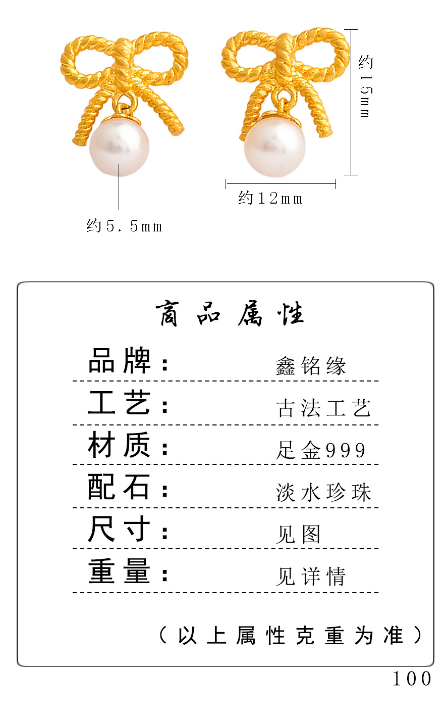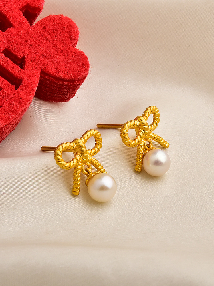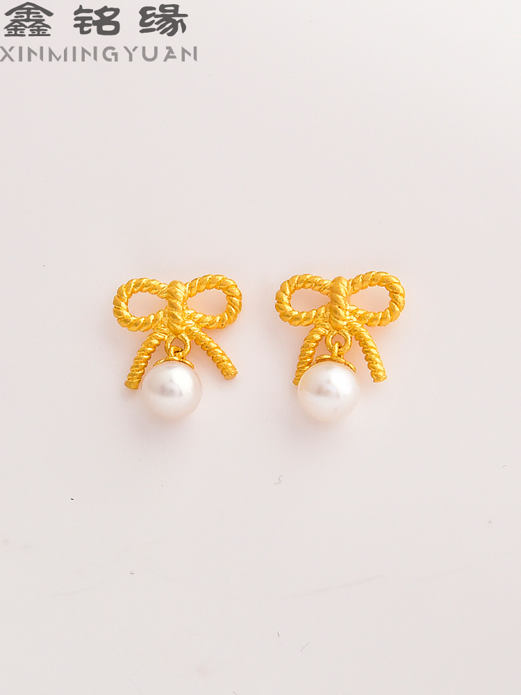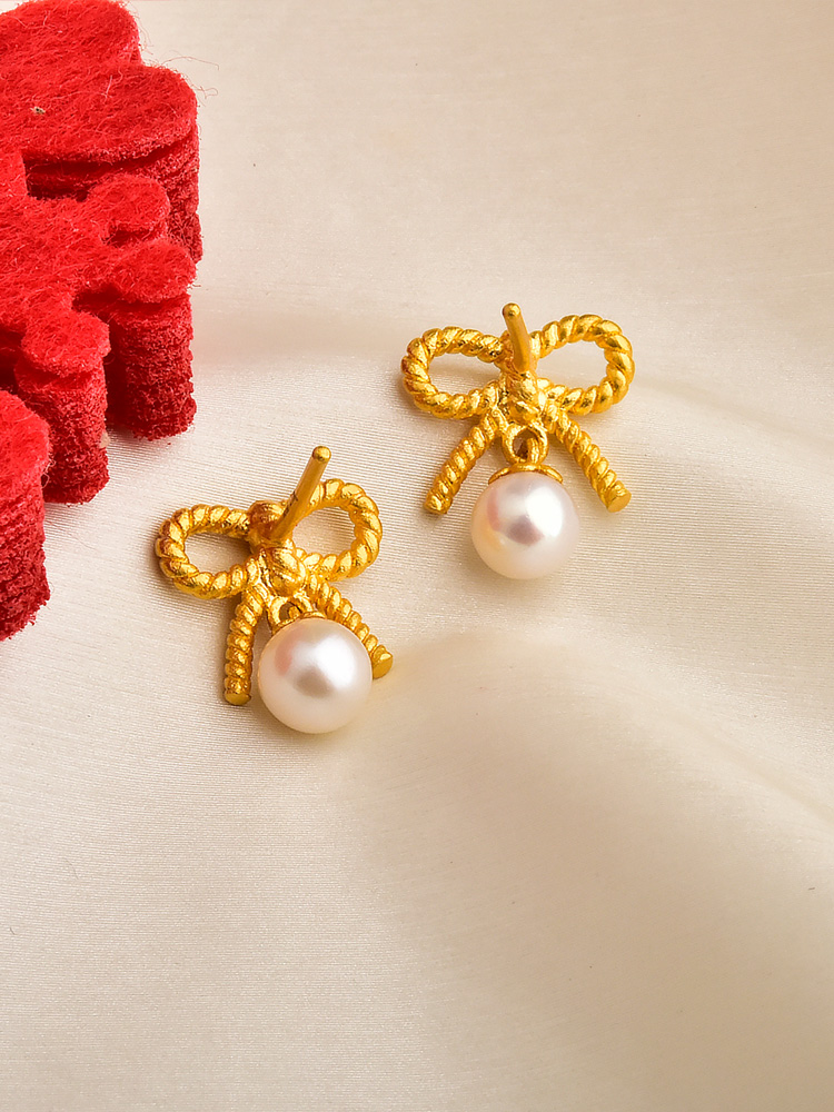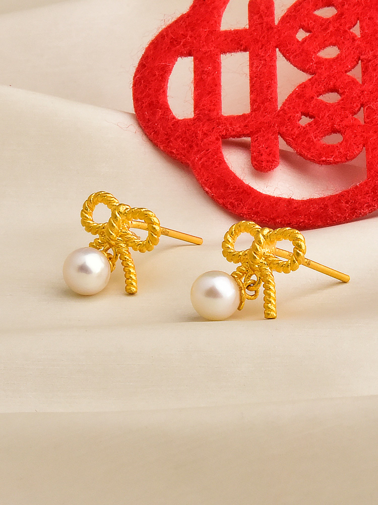 足金珍珠麻花蝴蝶结耳钉