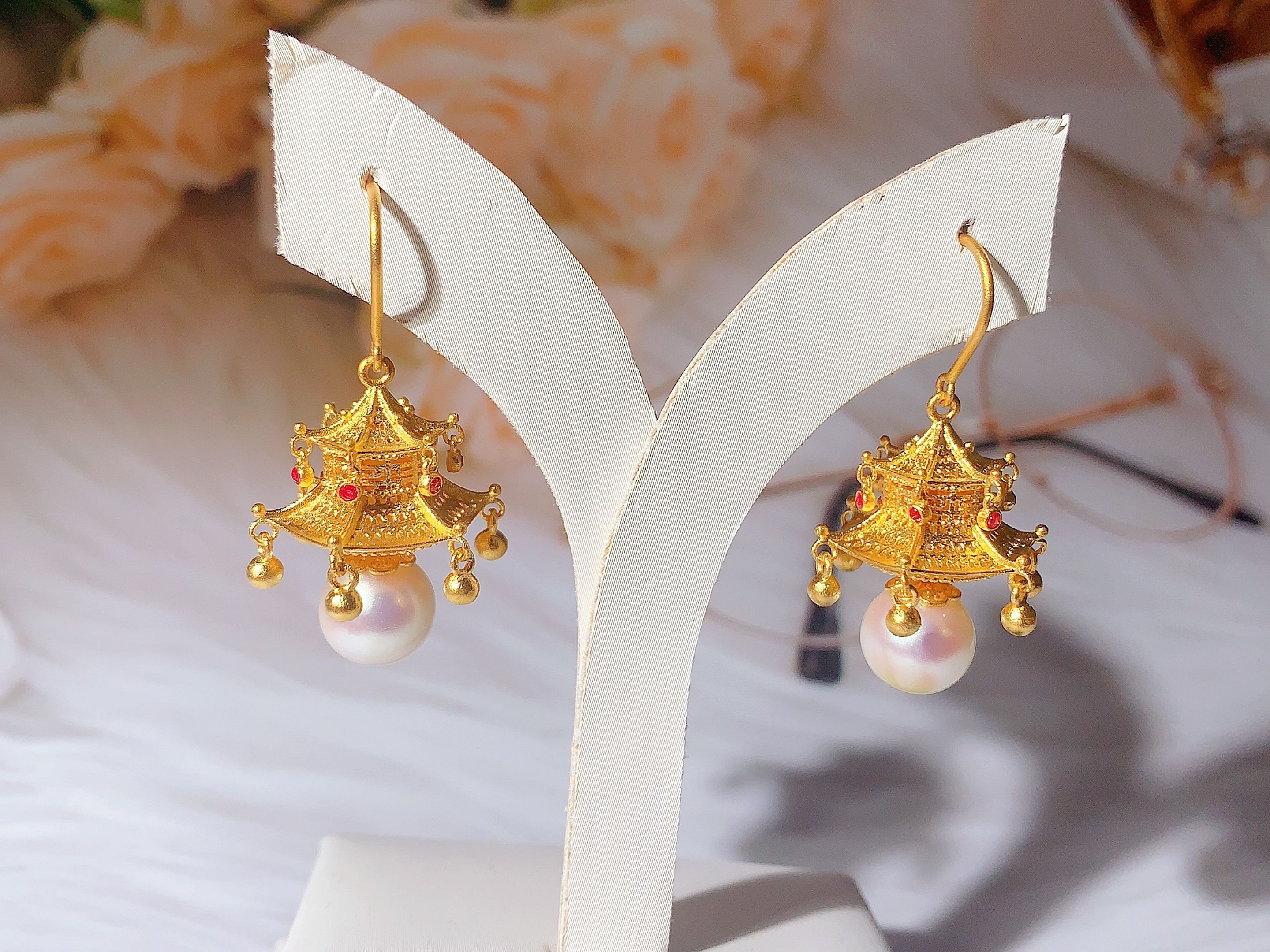 足金长款流苏贝珠耳环